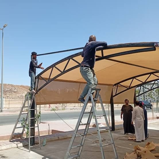 التركيب: تُثبت الأعمدة والهياكل الأساسية، ثم يتم تركيب القماش أو الألواح الخشبية أو الحديدية حسب النوع المختار.